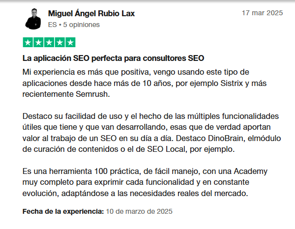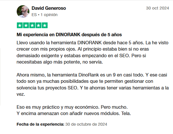 Muchos usuarios destacan la excelente relación calidad-precio y cómo Dinorank les ha permitido acceder a herramientas profesionales que antes estaban fuera de su alcance. Un usuario comenta que incluso ha dejado de utilizar Semrush para pasarse a Dinorank tras descubrir sus funcionalidades.